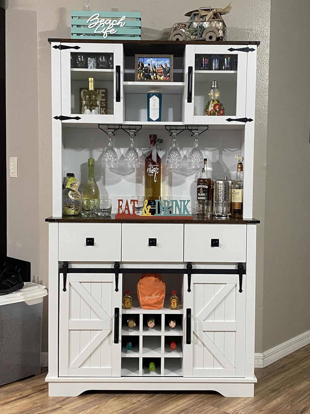 I liked the sliding doors, the fact that it had designated wine glass holders that holds 6 glasses, and the wine rack for 9 bottles. Most shelves are removable or adjustable so I could trailer it to fit our needs. I especially like the wood feature as the countertop and on the very top. It looks like super classy dark wood.