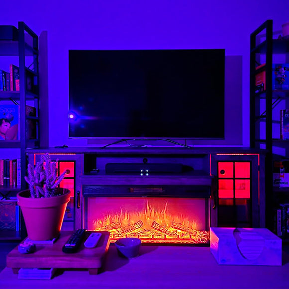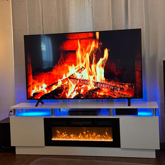 Had received the fireplace one day then the tv stand the next. They notified me two-box delivery.Took me about 2 hours to assemble but instruction manual is spot on, fairly easy. Love the dynamics of colors mixing and matching. I’d definitely recommend.