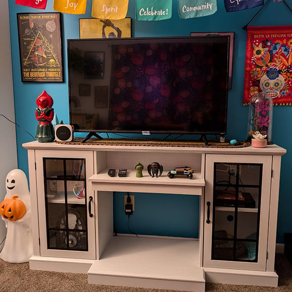 It feels sturdy and even has little plastic feet. I was worried it would scuff my floor when I needed to push it against the wall, but it moved easily and left no marks.The fire effect looks very nice and it puts out good heat! There are cheaper TV stands out there, but I'm glad I spent a little more on this one.
