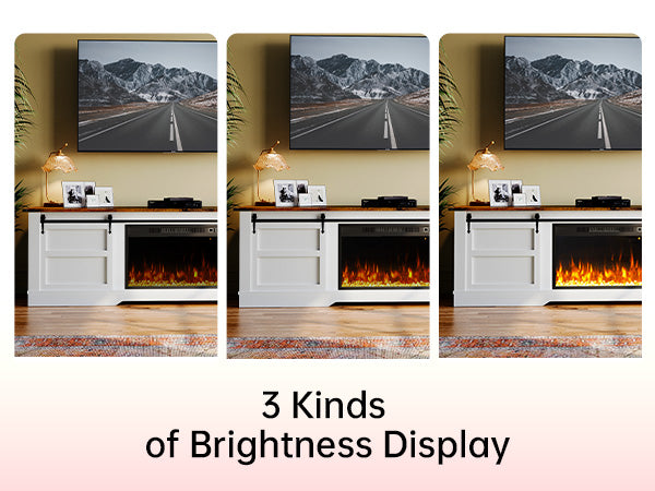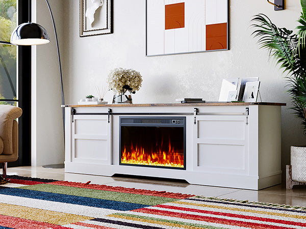 This entertainment center with fireplace is equipped with a 18" electric fireplace, which comes with 1500W first gear heating switch and 3D flame effect, creating a warm environment. Besides, it has overheating protection device to further ensure the safety (when the temperature controller is operating at 80℃, the power is cut off, and the function will be restored after cooling down)