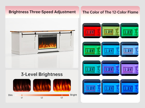 This entertainment center is equipped with a 18 inch/23 inch fireplace that features 12 LED colors of light strips, providing different atmosphere and creating a stunning visual effect.