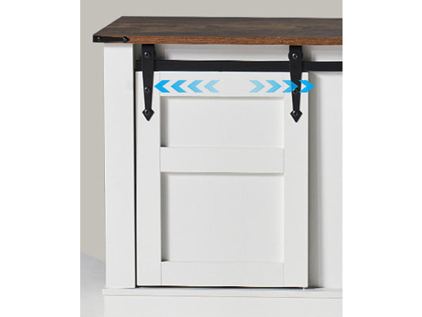 The farmhouse TV stand has 2 movable sliding barn doors allowing for easy access to cabinets and keep private as well. You can also move these doors on one side or separate them on 2 sides to satisfy different storage or display needs. Smooth and high quality track makes no noise while sliding