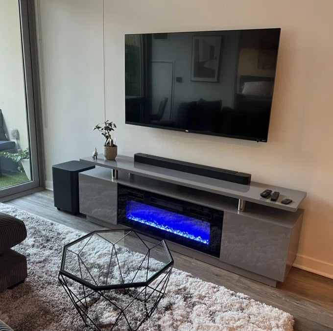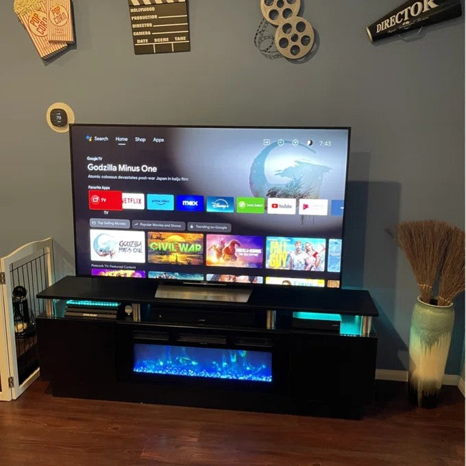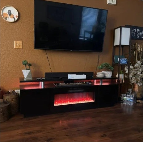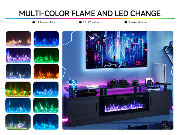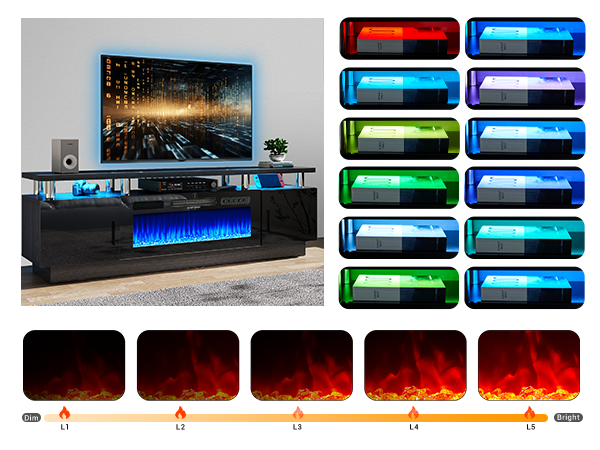 70"L stand integrates twelve colors electric fireplace with five dimmer levels & thirty-six colors LED color combos for a customizable viewing & heating experienceSturdy