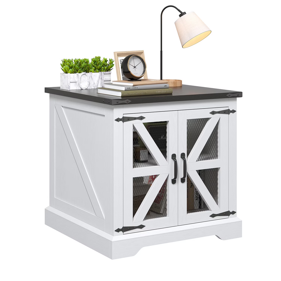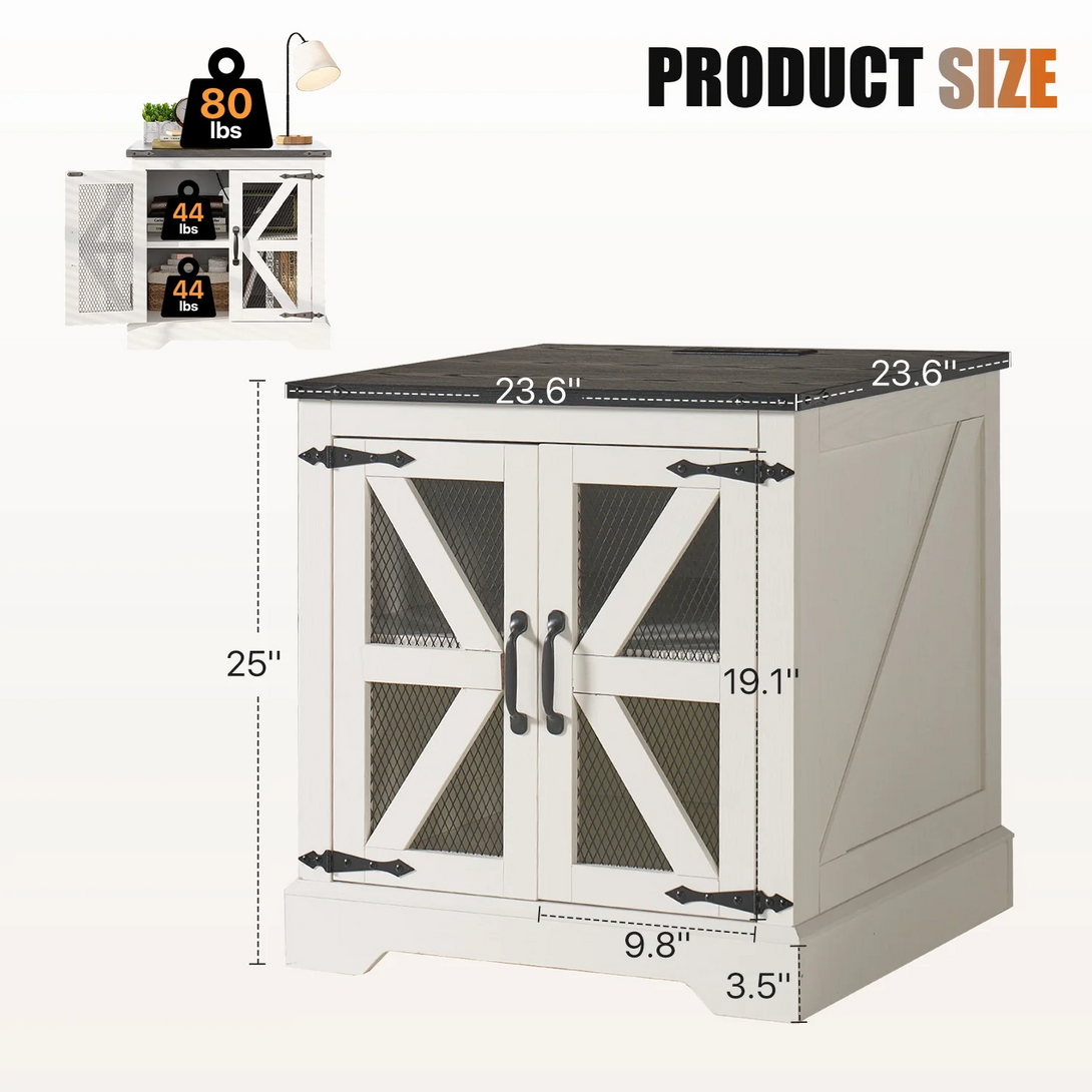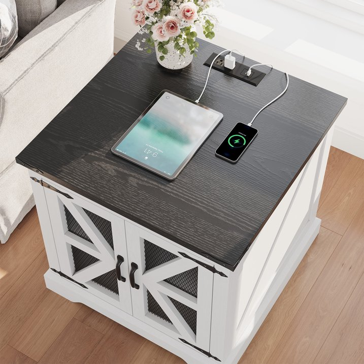 Easoger Farmhouse End Table, 24" Sofa Side Table with Charging Station Mesh Barn Door,Wood Nightstand with Adjustable Storage Shelf, Square Bedside Table for Living Room,Bedroom,Office-White