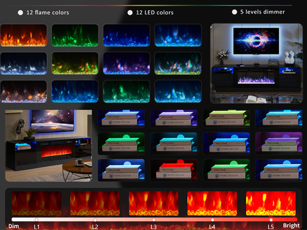 Customize your ambiance with 12 flame colors and 12 LED options. Perfect for any occasion, the 5 level dimmer function lets you adjust brightness to create the ideal atmosphere, adding warmth and personality to your home.