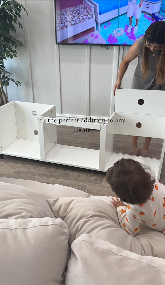 The TV Stand have 2 cabinets provide plenty of space for your entertainment accessories. The spacious tabletop provides open space for media, frames, plants, books, equipment, and any other home décor. The entertainment center has cable holes designed in the back for stowing away cable extras. The tv console give you the freedom to organize the space for your items, making it a stylish entertainment center.